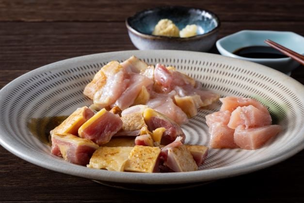 赤鶏、ごいし鶏、黒さつま鶏 いづれもタタキにしてあります。